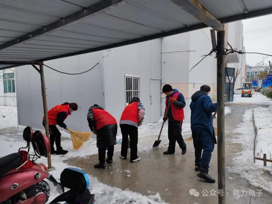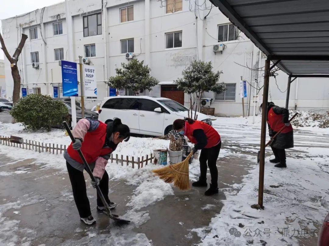 在掃雪過程中,黨員同志奮勇當(dāng)先,青年志愿者沖鋒在前,有的用鐵鍬向兩邊清理積雪,有的在后面奮力用掃把掃雪,積雪濺在衣服和鞋上也毫不在意,掃雪現(xiàn)場一片繁忙景象。一個(gè)多小時(shí)后,鼎力電子門前道路及車棚被清掃得干干凈凈。